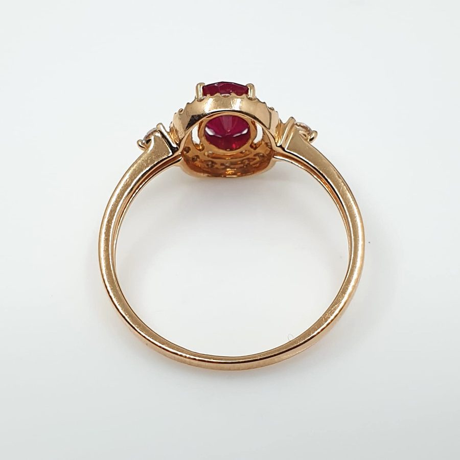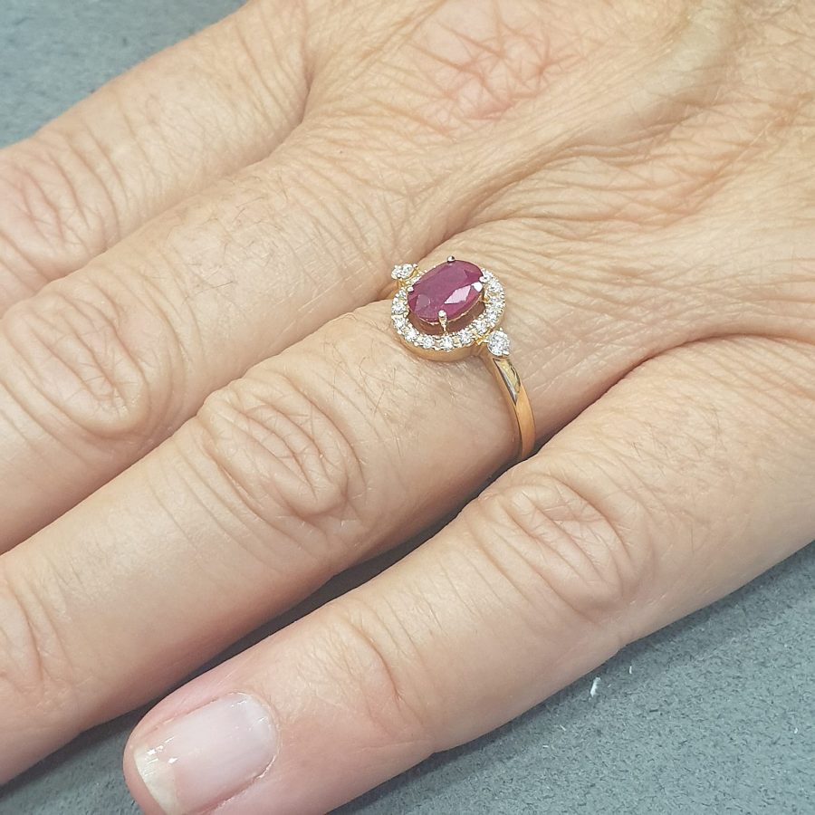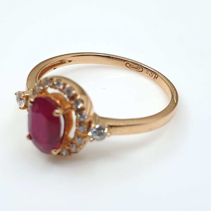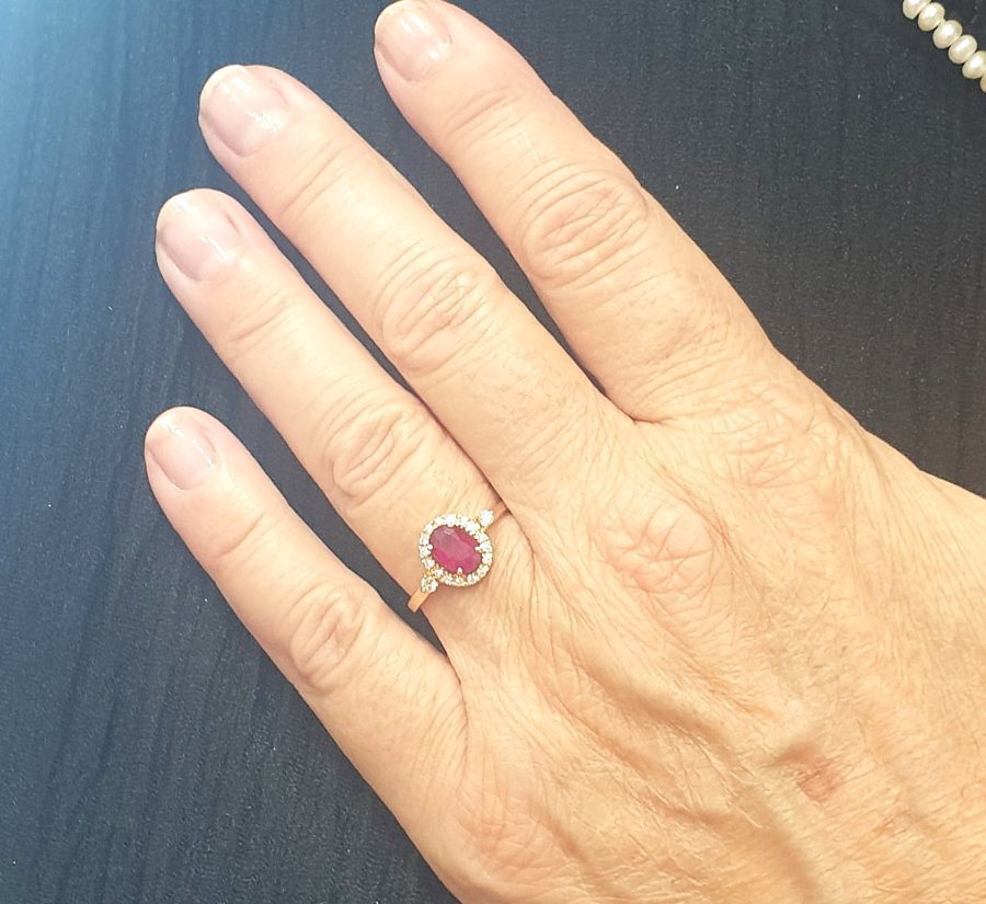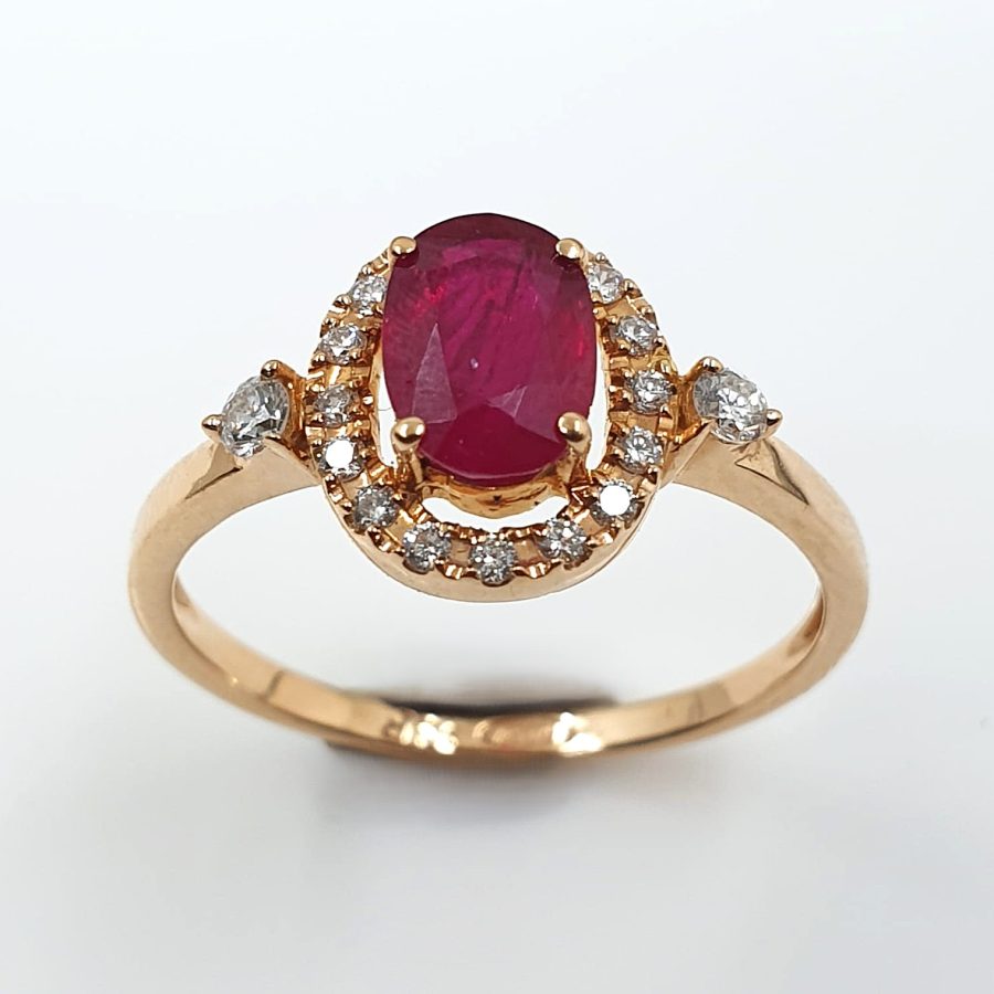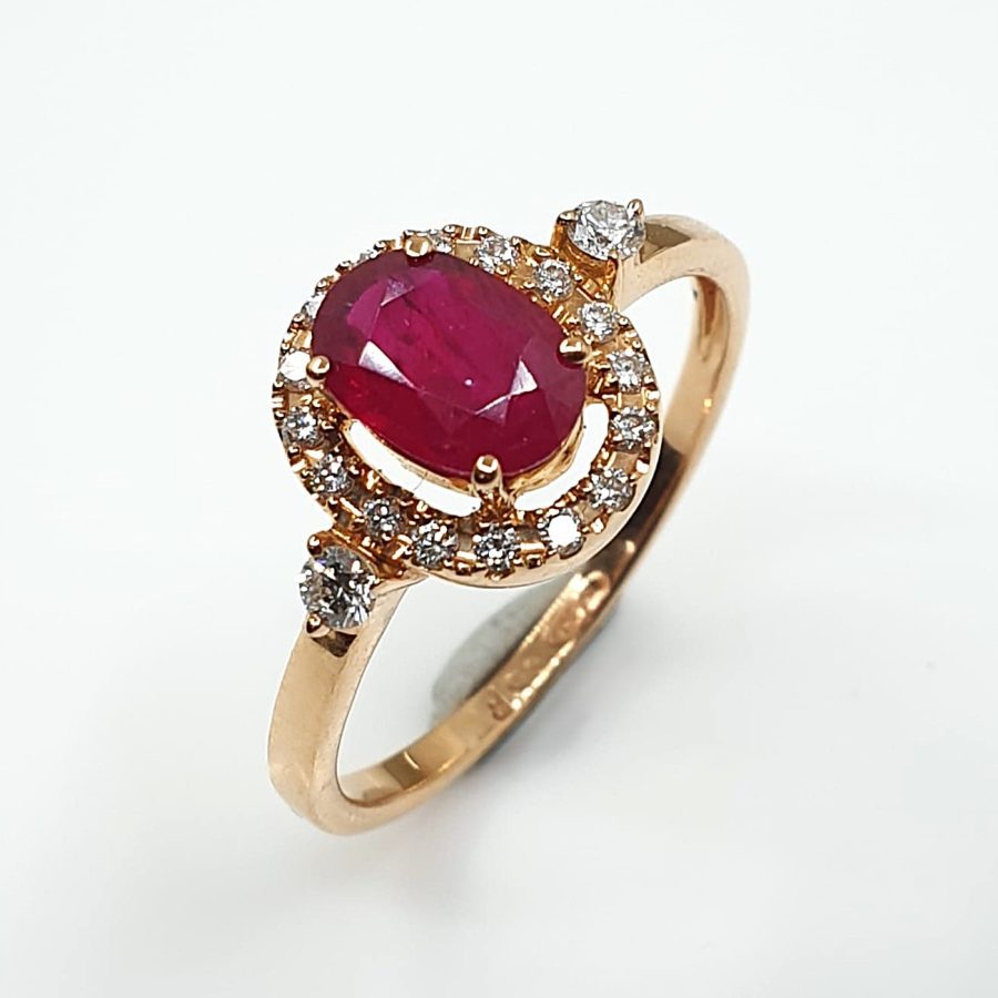 Exclusivo anillo de oro rosa de 18k, talla Nº 14, con un ancho de 10.06 mm y peso de 2.30 gramos. Su protagonista es un intenso rubí de 1.10 ct, rodeado por una delicada orla de brillantes de 0.192 ct que realzan su elegancia y sofisticación. Una joya con certificado de autenticidad, ideal para quienes buscan distinción y belleza en una sola pieza. 244-00584