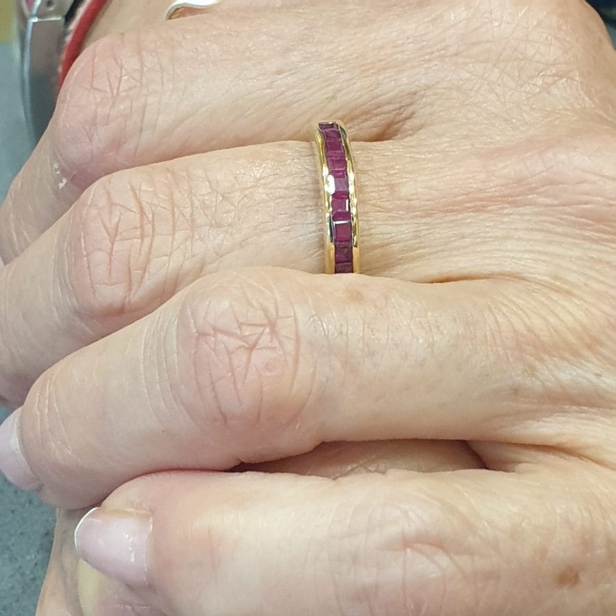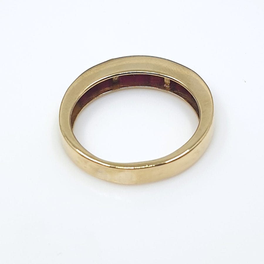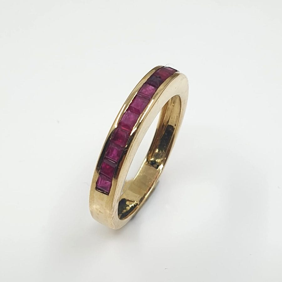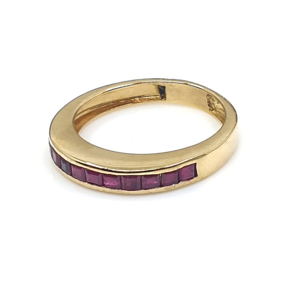 Media alianza en oro de 18k, engastada con rubíes talla carrée que aportan un brillo intenso y sofisticado. Con medida nº 16, ancho de 3.50 mm y peso de 3.66 gramos. Los rubíes han sido apreciados a lo largo de la historia como piedras de poder y nobleza, convirtiendo esta joya en una pieza de lujo atemporal. B01581461