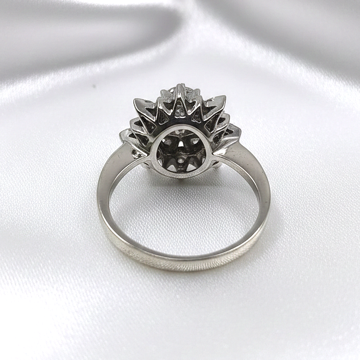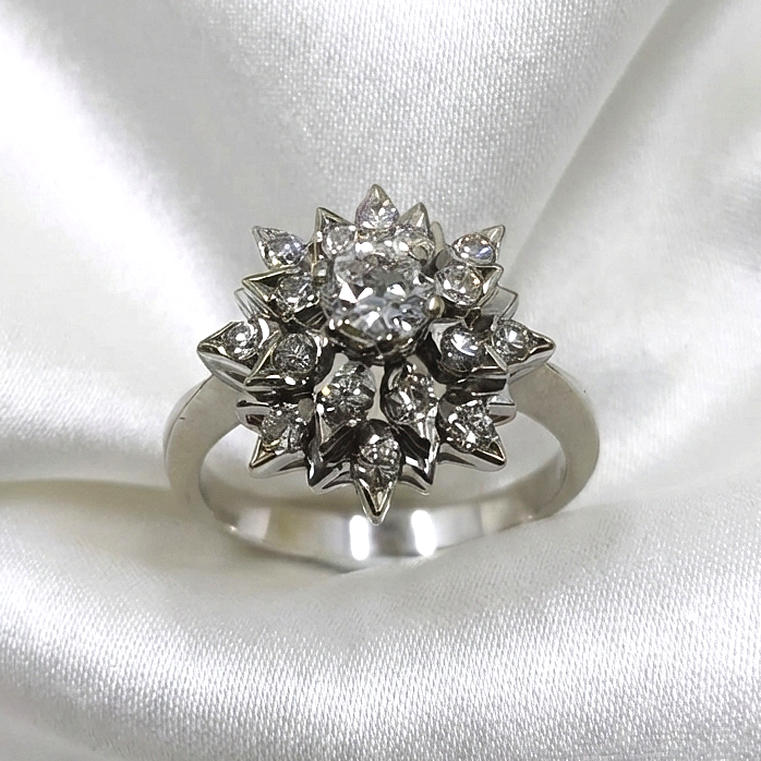 Deslumbra con este espectacular anillo vintage realizado en oro blanco de 18 quilates, cuyo impresionante diseño frontal en forma de estrella está cuajado de brillantes que envuelven un magnífico diamante central de 0.50 ct. Es una joya de gran presencia y elegancia, con un ancho notable de 14.88 mm, un peso de 4.96 gramos y en medida nº 15, perfecta para quienes buscan una pieza única que capte todas las miradas. B01587475