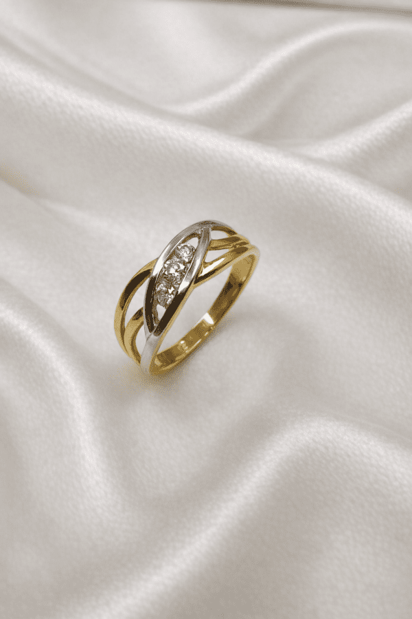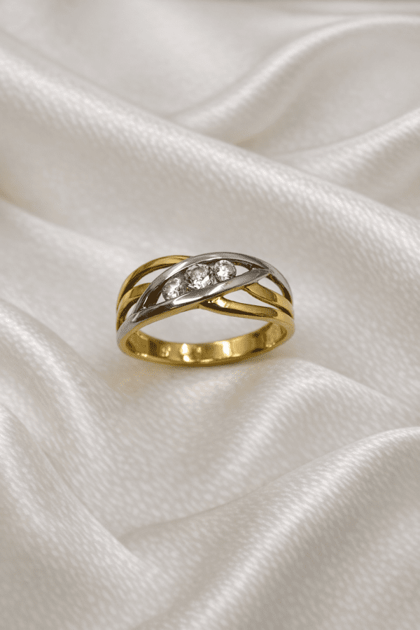 Anillo original Tynel de oro 18k con diseño bicolor y tres circonitas engastadas, en talla 13, ancho 7 mm y peso 1.94 g, en estado impecable y listo para usar, ideal como regalo o para ocasiones especiales. B01587089