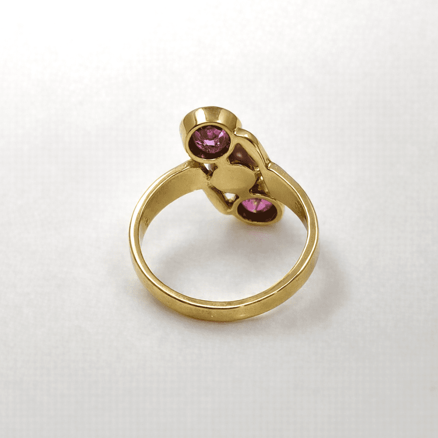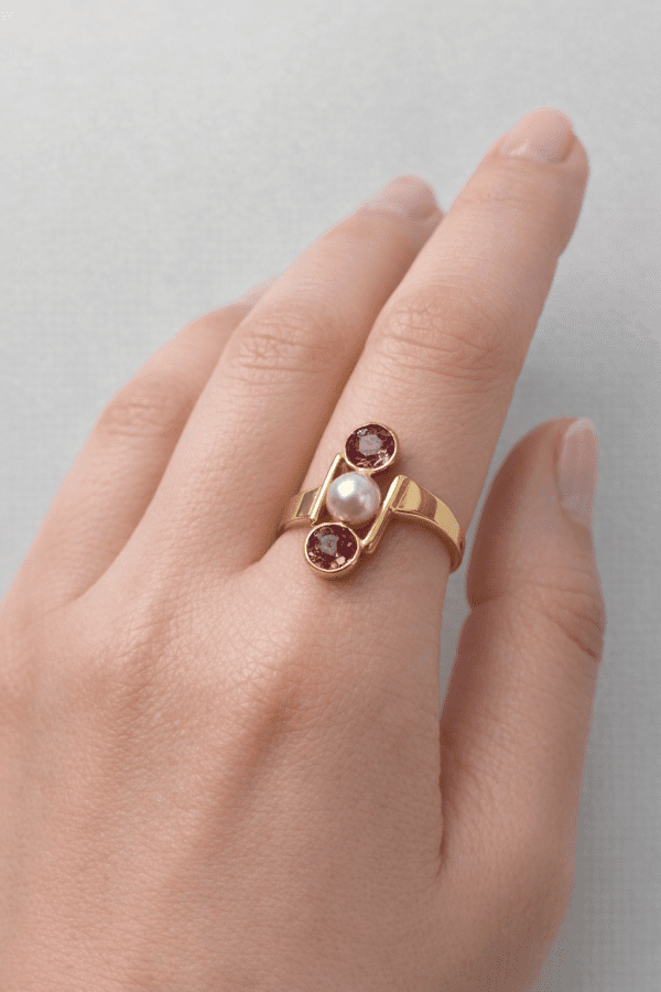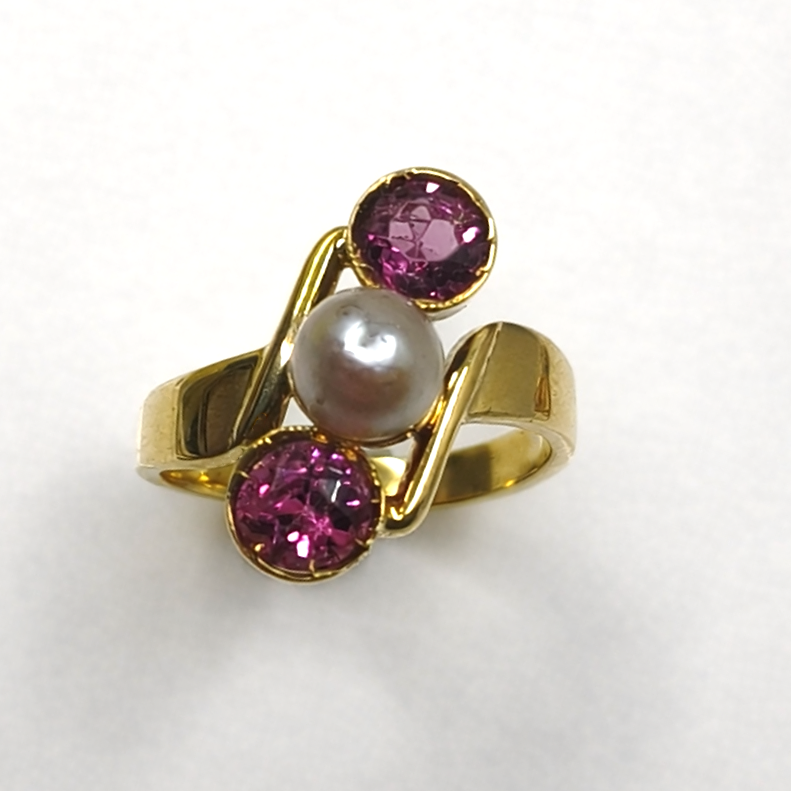 Anillo vintage en oro de 18k con turmalinas y perla cultivada. Diseño elegante y asimétrico con dos turmalinas rosadas facetadas y una perla central de brillo natural. Talla nº 12, ancho 17 mm, peso 4.24 g. Pieza única con acabado artesanal y estilo clásico, ideal para colección o uso diario. B01581209