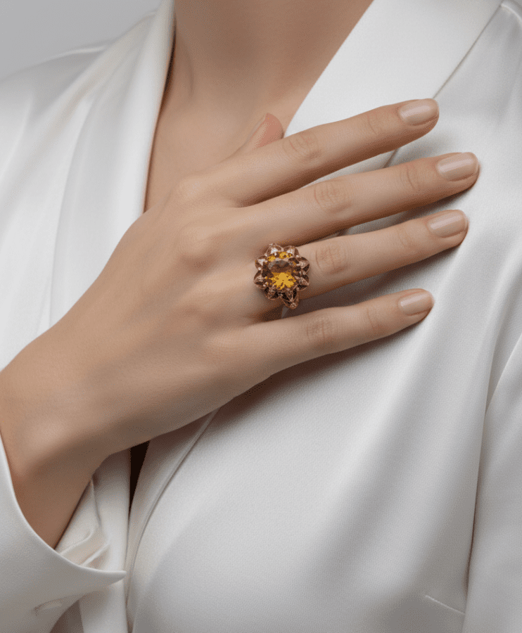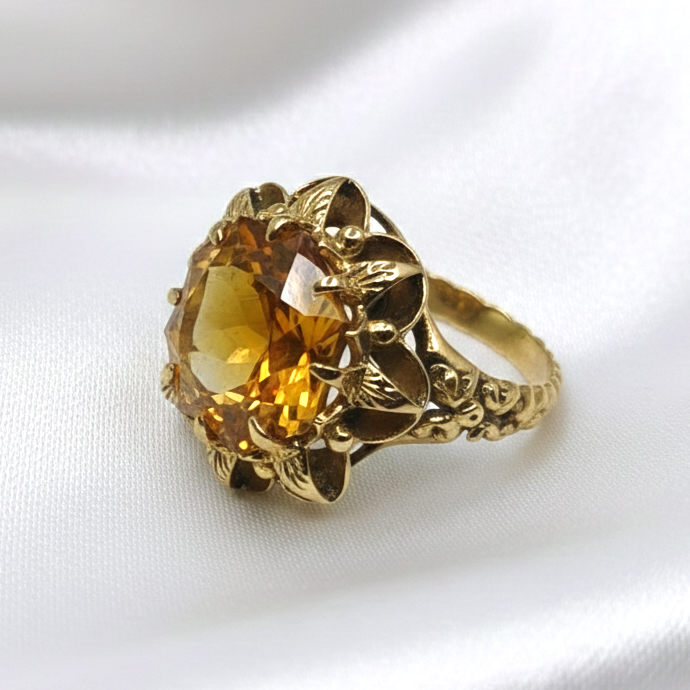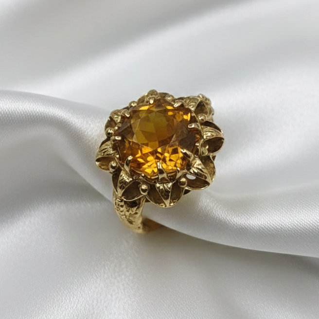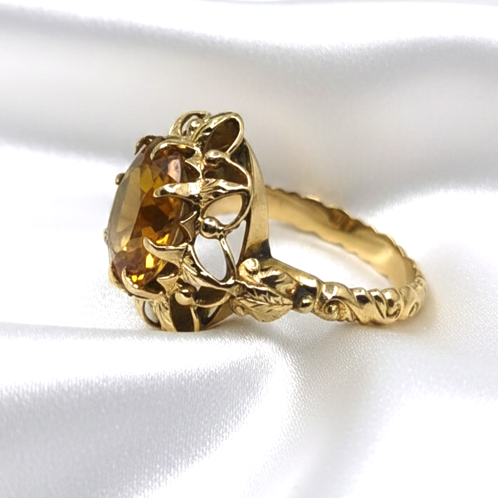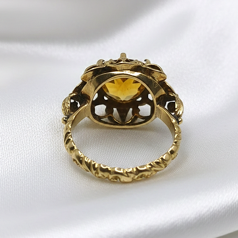 Este espectacular anillo de oro de 18k con un citrino central es la pieza ideal para quienes buscan distinción y elegancia, con un peso de 6.62 gr, un ancho de 18.80 mm y talla nº 13, su diseño artesanal resalta por un brillo excepcional y una presencia impecable. B01587082
