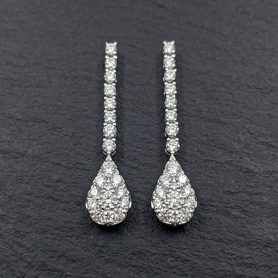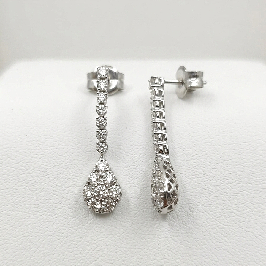 Espectaculares pendientes largos realizados en oro blanco de 18 kilates, una pieza de alta joyería que destaca por su exquisito diseño y luminosidad. Cada pendiente presenta una elegante línea de brillantes que culmina en una sofisticada lágrima cuajada de diamantes, sumando un peso total de 0.90 ct. Con unas medidas de 26 mm de largo y 6.90 mm de ancho, ofrecen un movimiento y un brillo excepcionales, ideales para novias o eventos de gala. B3715-7-101